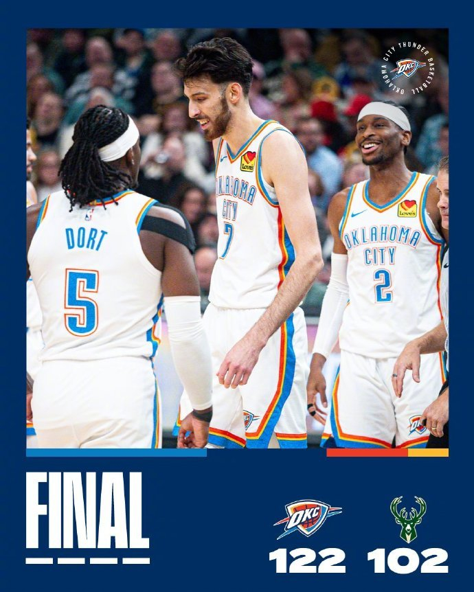 上一场大胜骑士之后,雷霆今天又在客场122-120击败雄鹿,取得两连胜,以3胜1负的战绩结束了客场之旅,战绩来到37胜8负,继续高居西部第一以及联盟第一。而雄鹿战绩为18胜25负,依旧排在东部第十一,无缘附加赛区。过去5场比赛,雄鹿仅1胜4负,只两分险胜了老鹰。